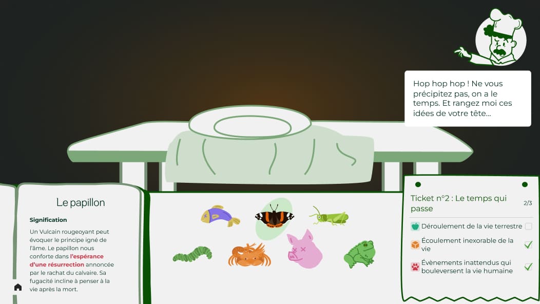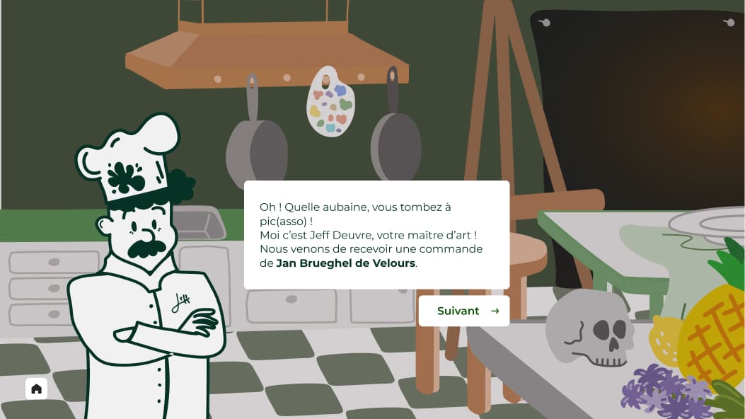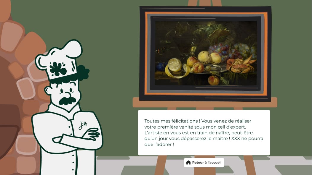 We chose to focus on vanity paintings and base the mecanics on 'Papa's Pizzeria' games. The player would recreate Jan Van KESSEL's 'Natures morte aux crustacés', guided by a little doodled chef : Jeff Deuvreve.