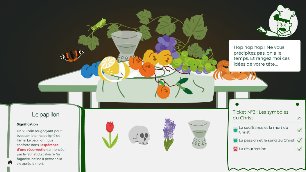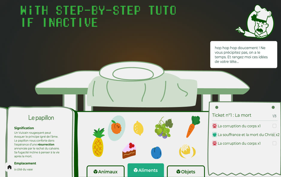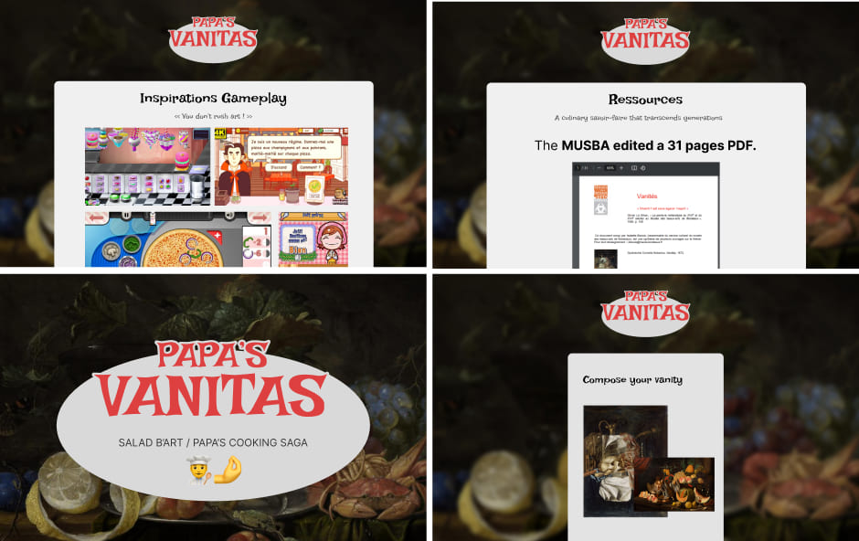 On the occasion of the 'Nuit Européenne des musées', the MUSBA and MMI decided to collaborate once again ! Our mission as MMI student was to create a full interface on a very large touch table. Divided in 6 groupes and a QA group, we had to create 5 different educational interactive experiences. We created the game 'Papa's Vanitas'.